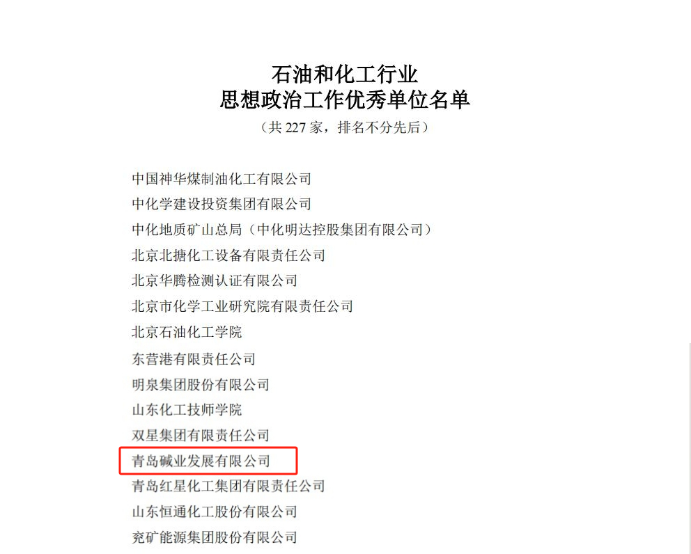 青島堿業(yè)榮獲“石油和化工行業(yè)思想政治工作優(yōu)秀單位”